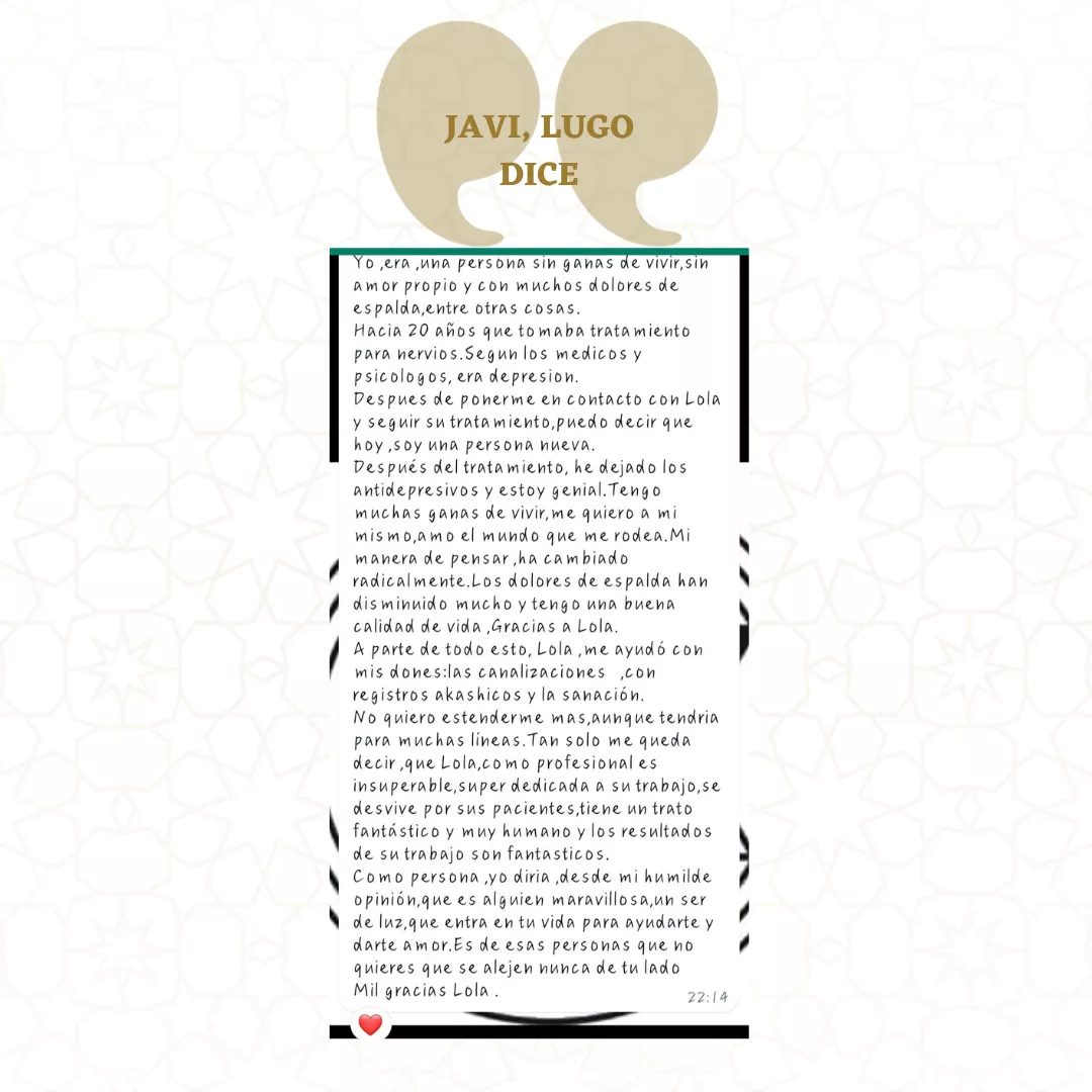 Soy Lola Rodríguez, FACILITADORA TRANSPERSONAL en EVOLUCIÓN CONSCIENTE y DESARROLLO ESPIRITUAL. Con más de 20 años de experiencia en administración de empresas, descubrí mi PROPÓSITO de VIDA y MISIÓN de ALMA hace 4 años a través del AUTOCONOCIMIENTO y DESARROLLO PERSONAL en CIENCIA ESPIRITUAL. Como CANALIZADORA, TERAPEUTA HOLÍSTICA y apasionada en METAFÍSICA, CUÁNTICA, SANACIÓN ENERGÉTICA, ANTROPOSOFÍA y MITOLOGÍA, comparto mi DON ESPIRITUAL a través de mis manos y SANACIÓN PRANICA a todas aquellas personas que el UNIVERSO me interpone. Únete a mí en este camino de evolución consciente y desarrollo espiritual.